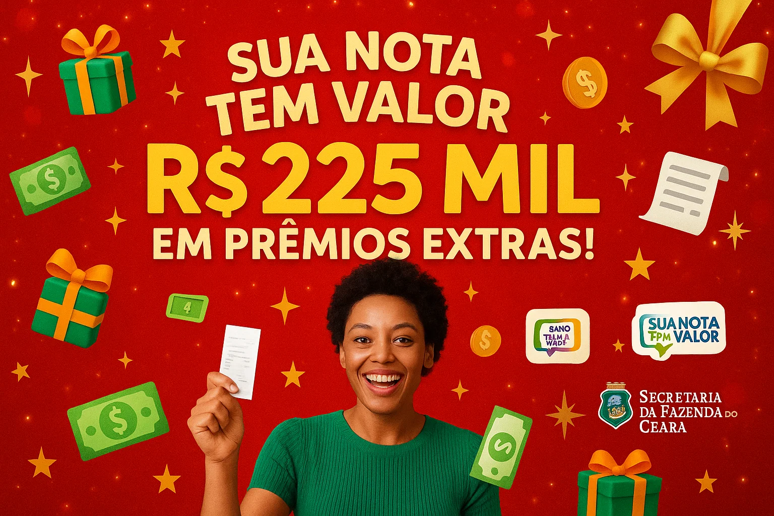 VITóRIA DA CONQUISTA, BA — O programa Sua Nota Tem Valor (SNTV), da Secretaria da Fazenda do Ceará (Sefaz-CE), trouxe uma grande novidade para o mês de dezembro. Serão distribuídos R$ 225 mil em premiações extras, com sorteio programado para janeiro de 2026. Essa edição especial do sorteio conta com prêmios de R$ 10 mil e R$ 5 mil para pessoas físicas e instituições parceiras. A premiação geral continua com valores de R$ 40 mil, além de prêmios de R$ 10 mil e R$ 500. Ao todo, serão mais de 150 prêmios para os participantes.