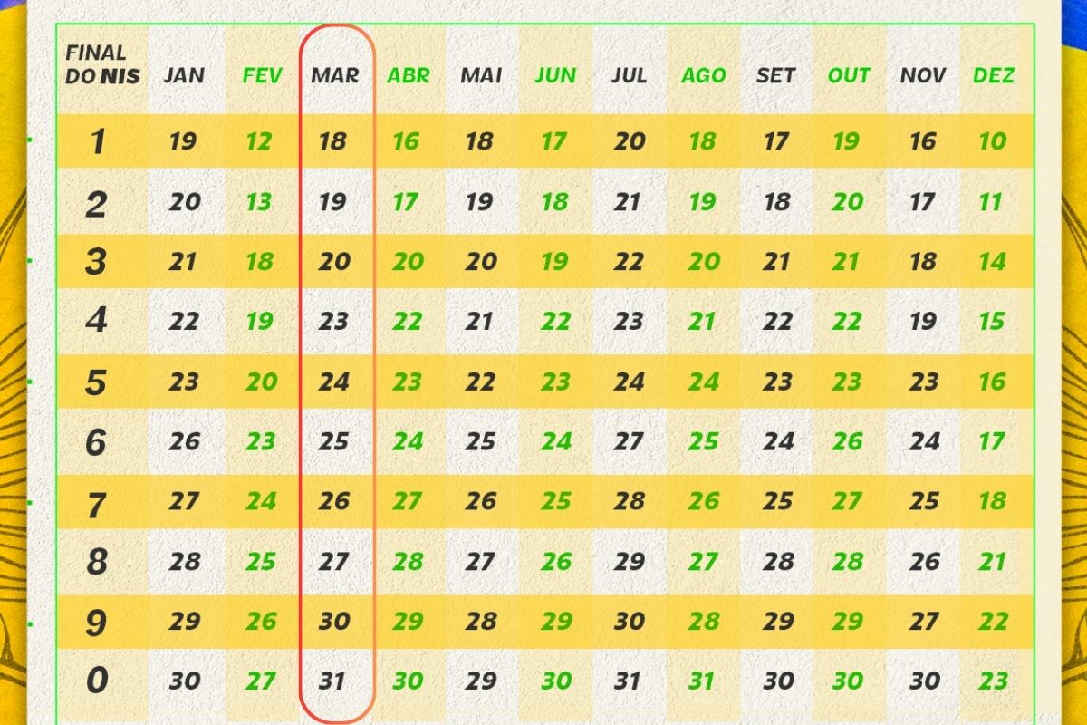 Confira abaixo as datas de pagamento conforme o final do NIS: