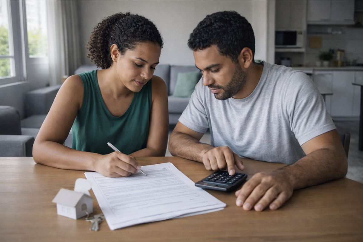 Um casal fazendo as contas para aproveitar o aluguel que vira renda