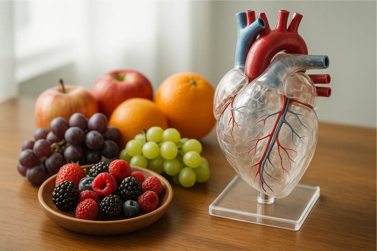 Frutas que "limpam" artérias ao lado de um coração de acrílico